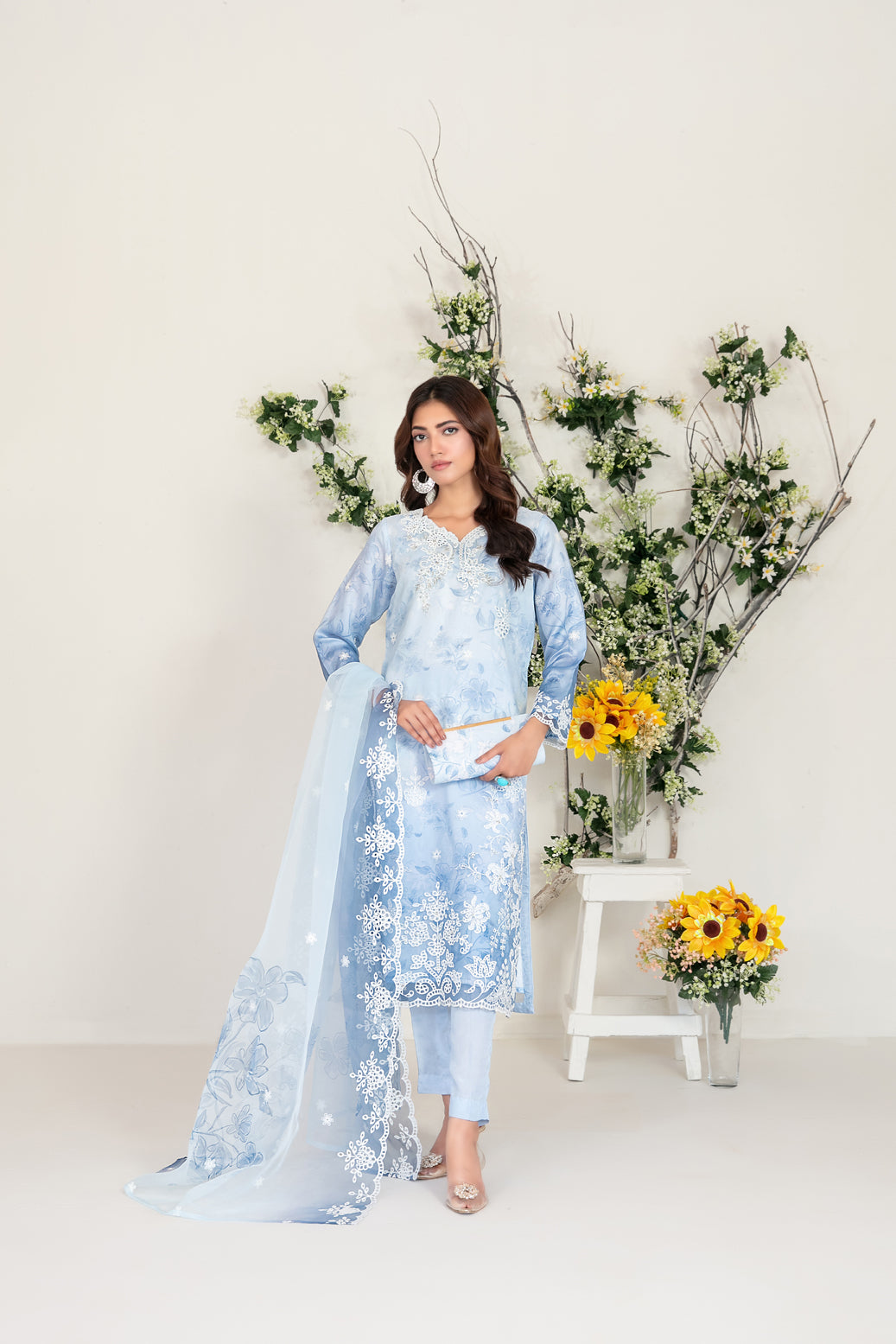 3 Piece Semi-Stiched Collection By Tawakkal Fabrics, Attractive & Elegant Organza Collection comes with: