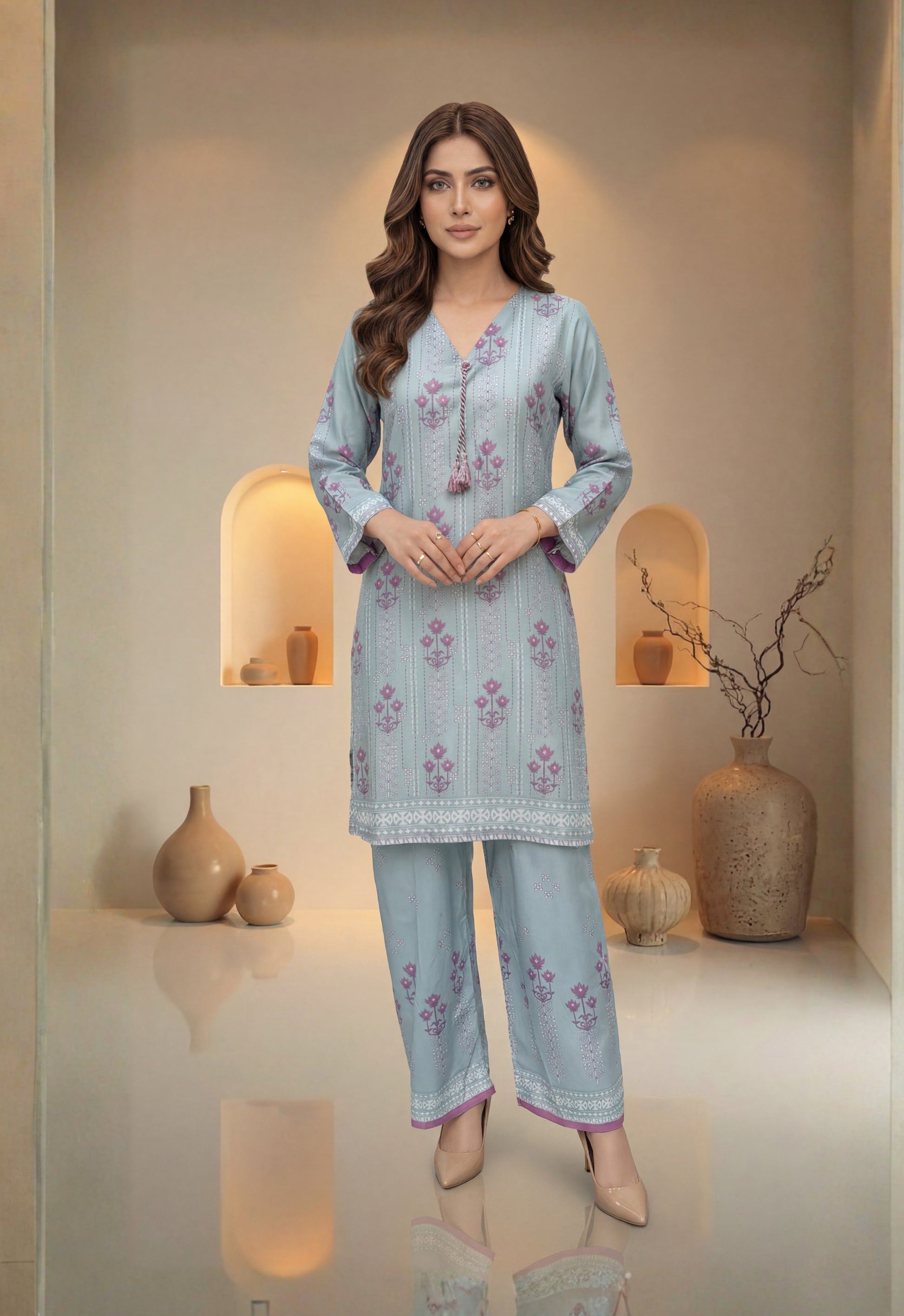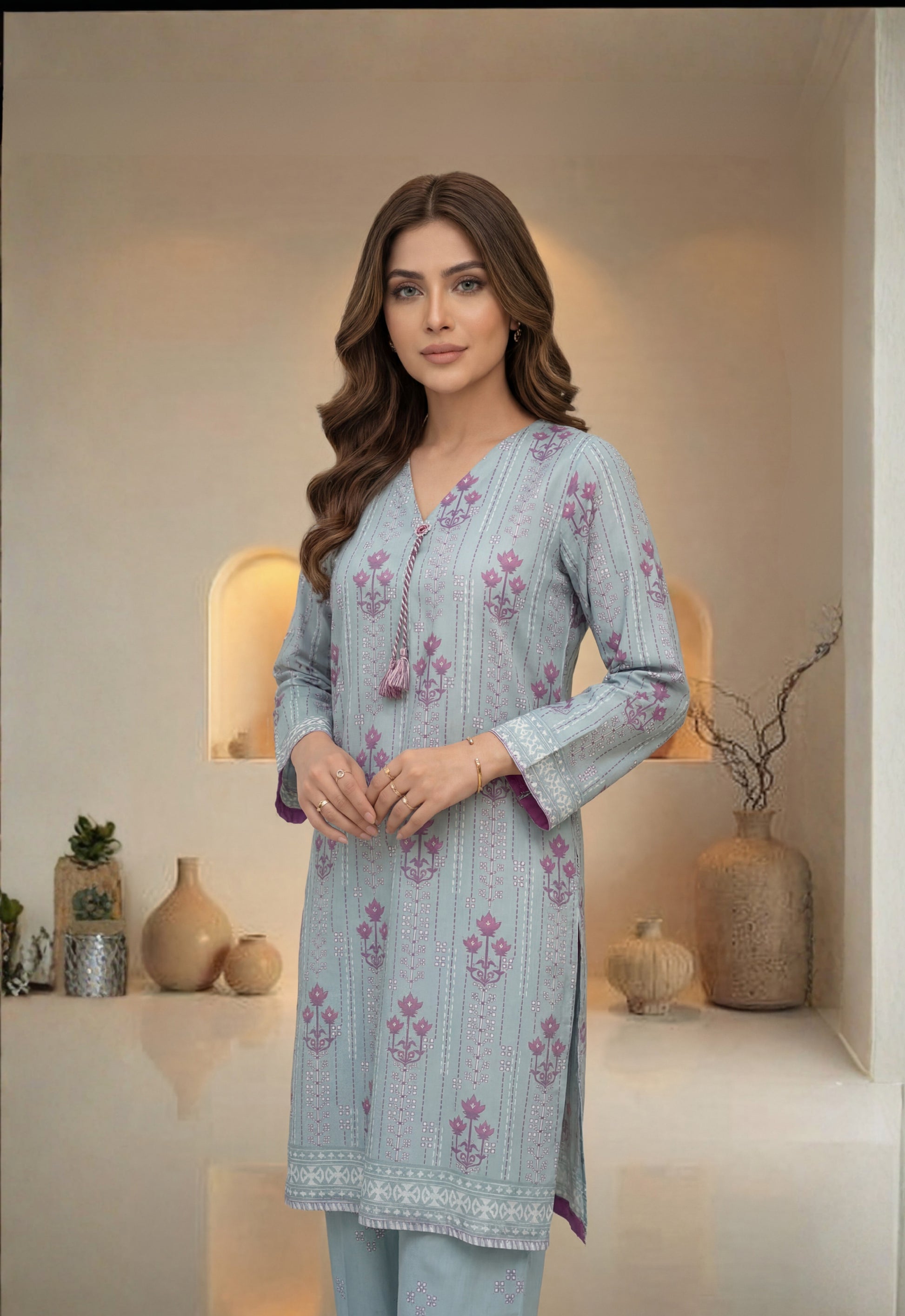 • Stitched Printed Swiss Shirt Designs with Embellishments