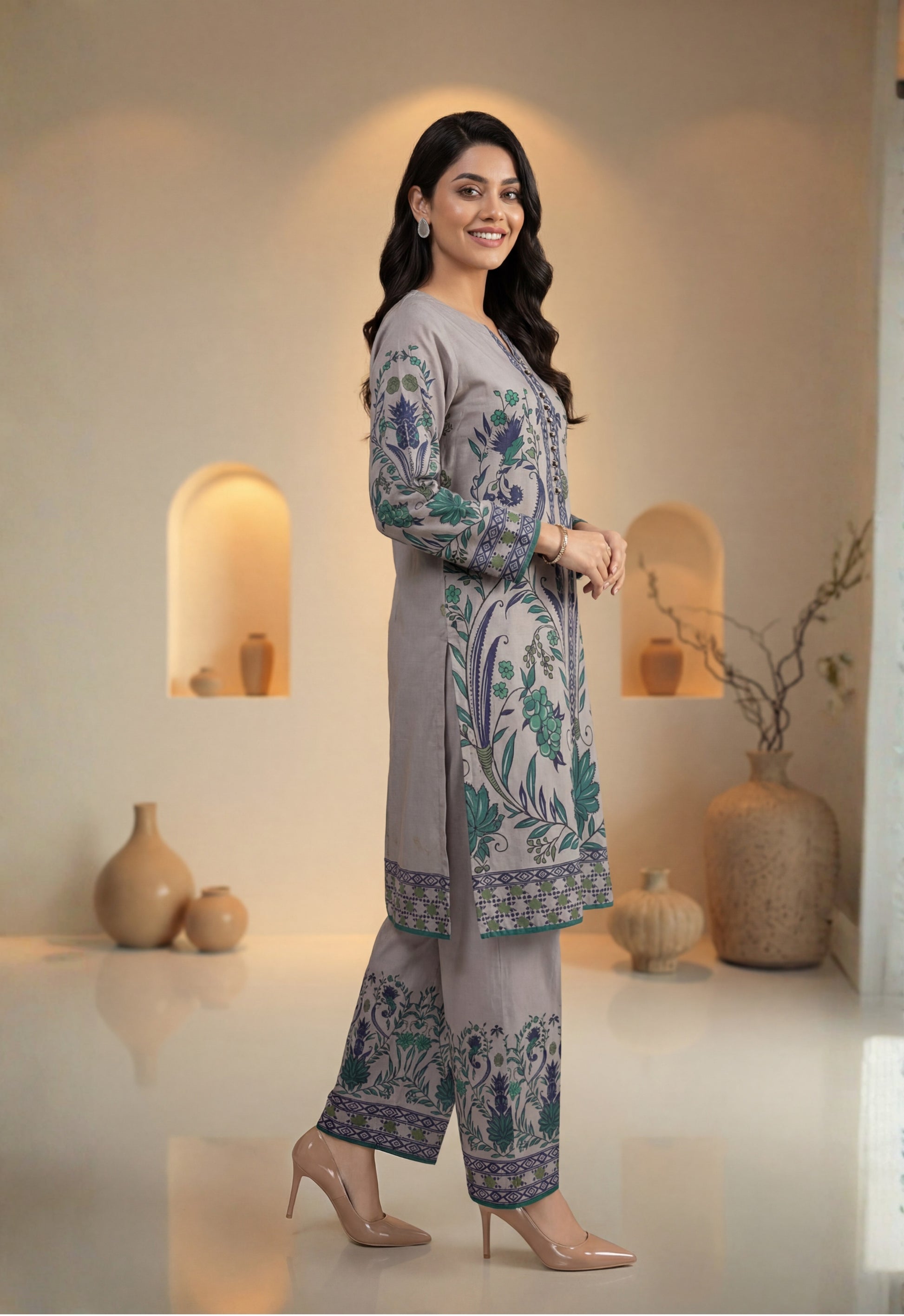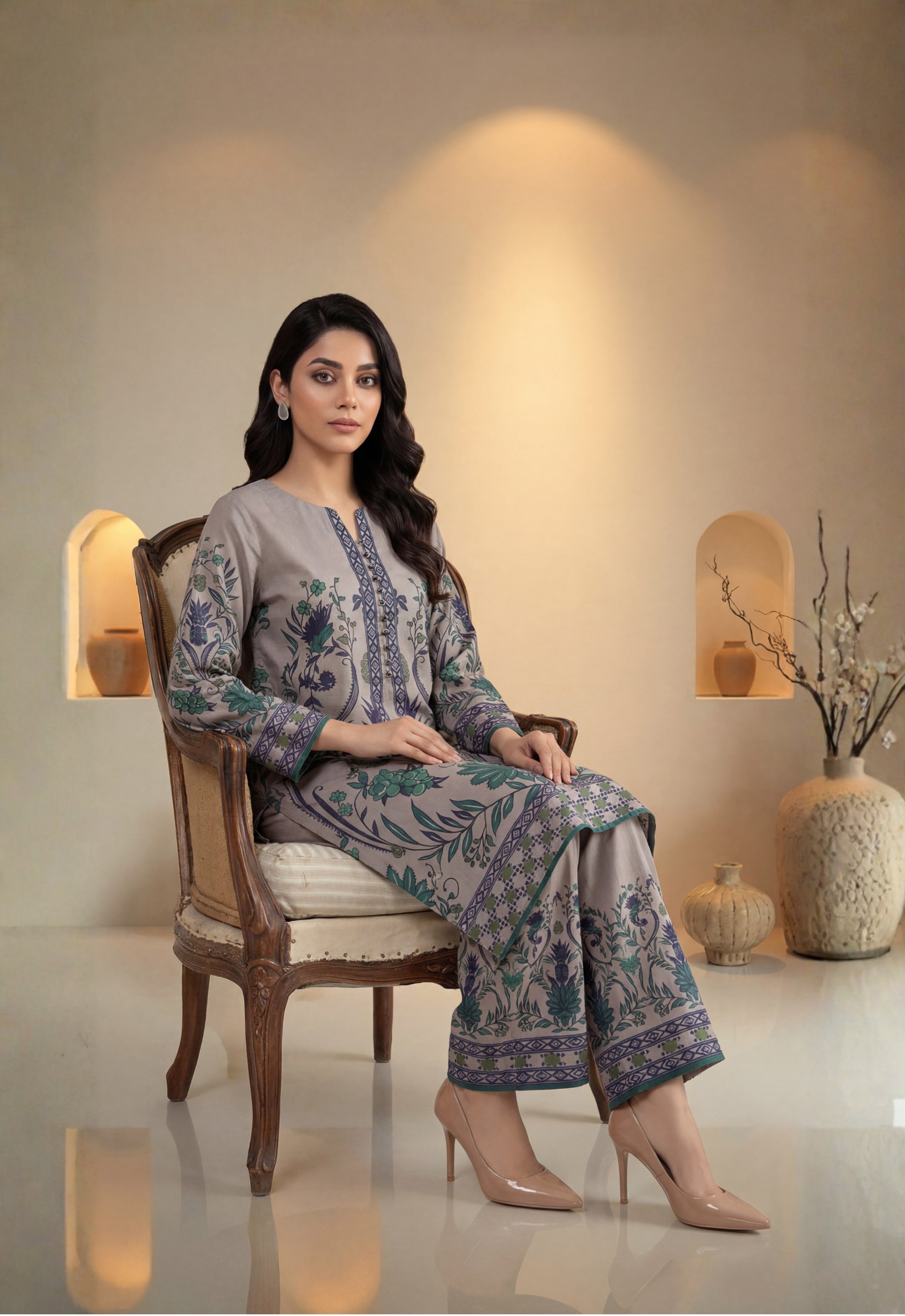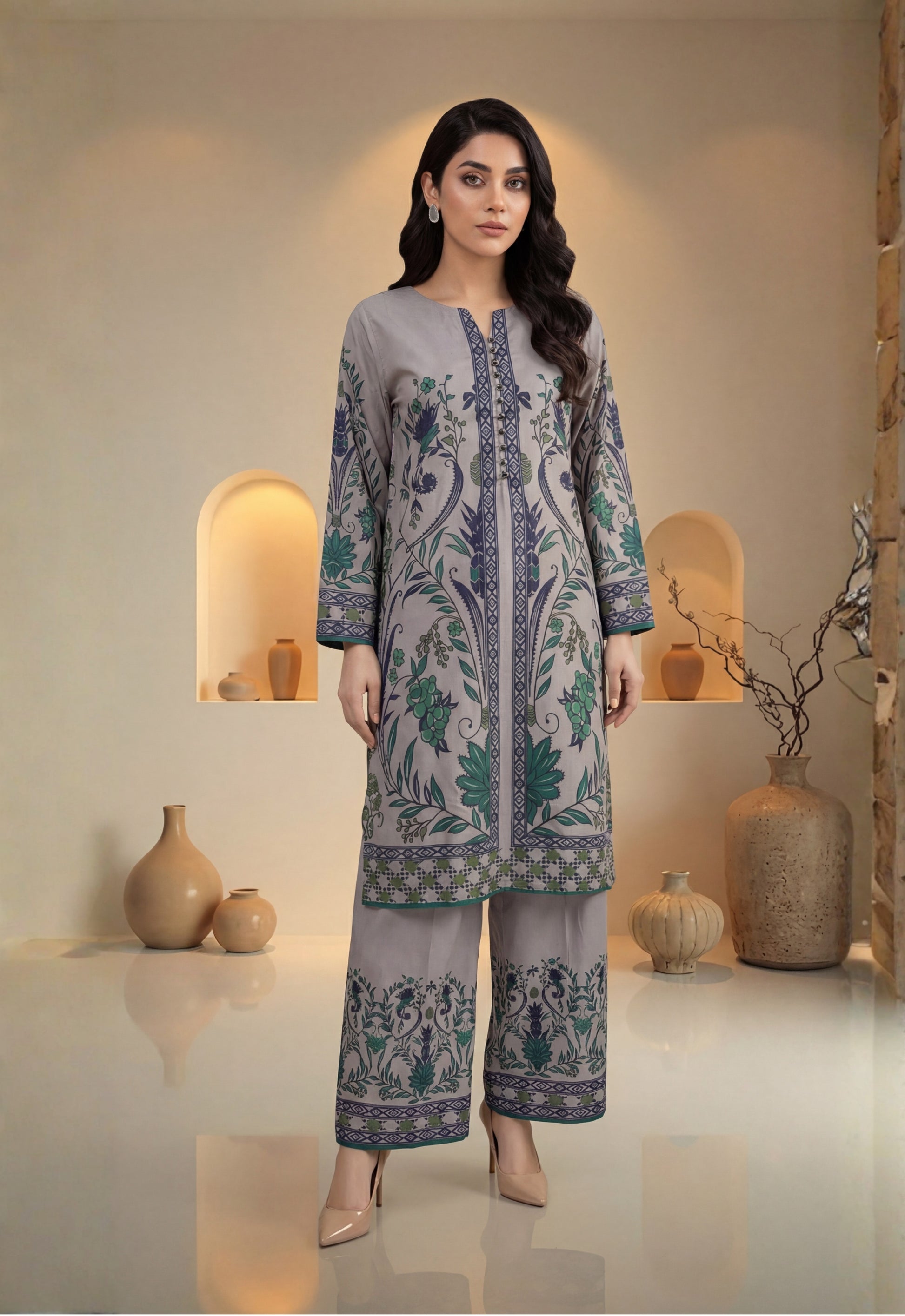 • Stitched Printed Swiss Shirt Designs with Embellishments