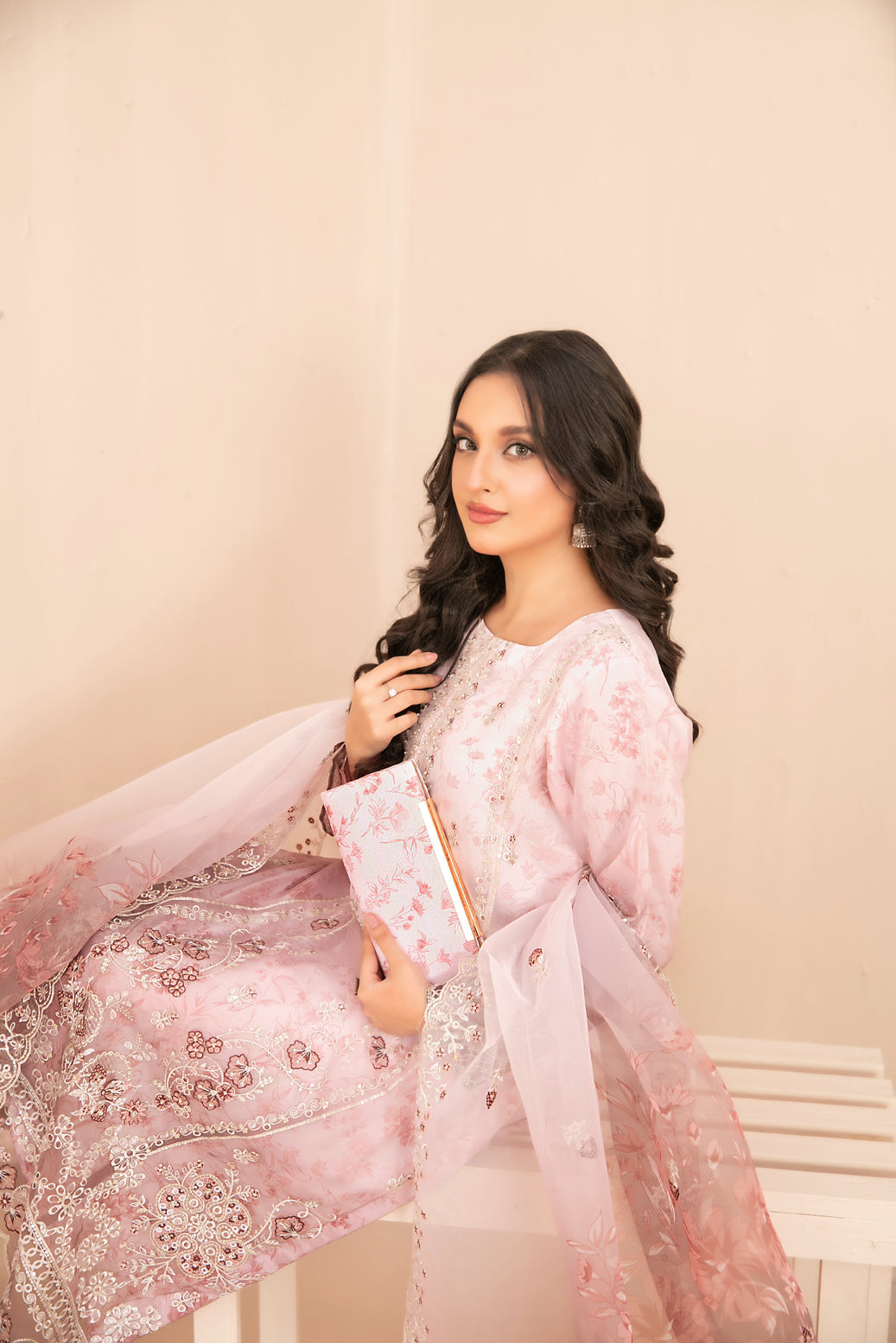• Semi-Stitched Fancy Heavy Embroidered Organza Shirt with embellishments & Digital Printed Silk Inner