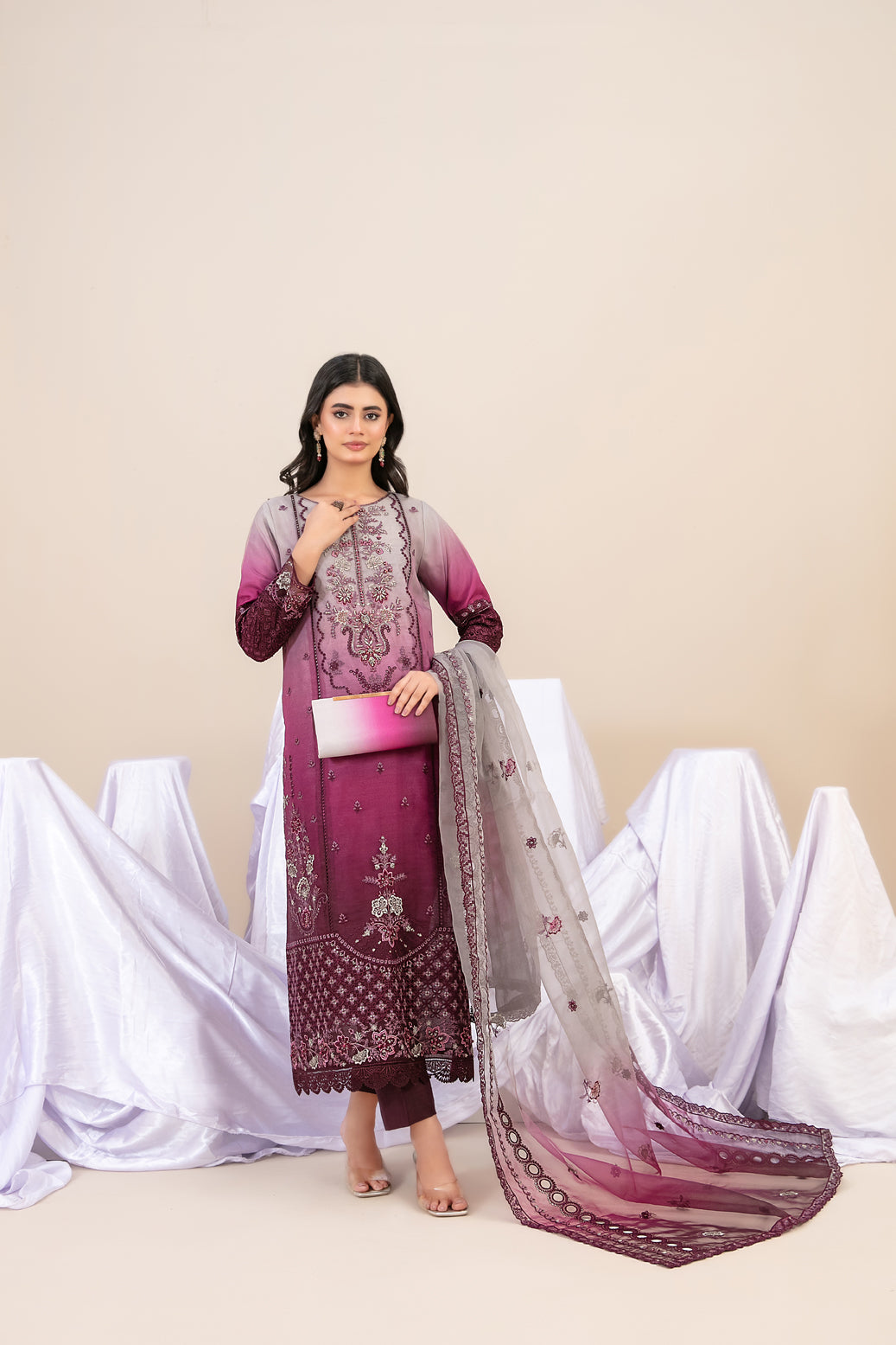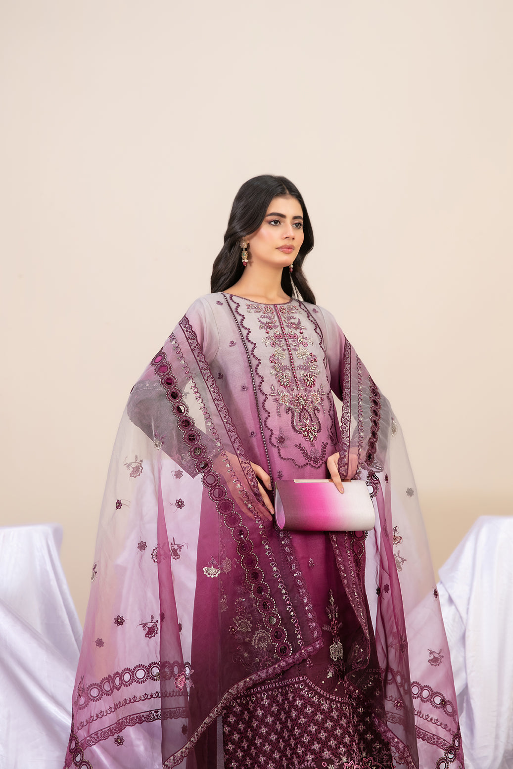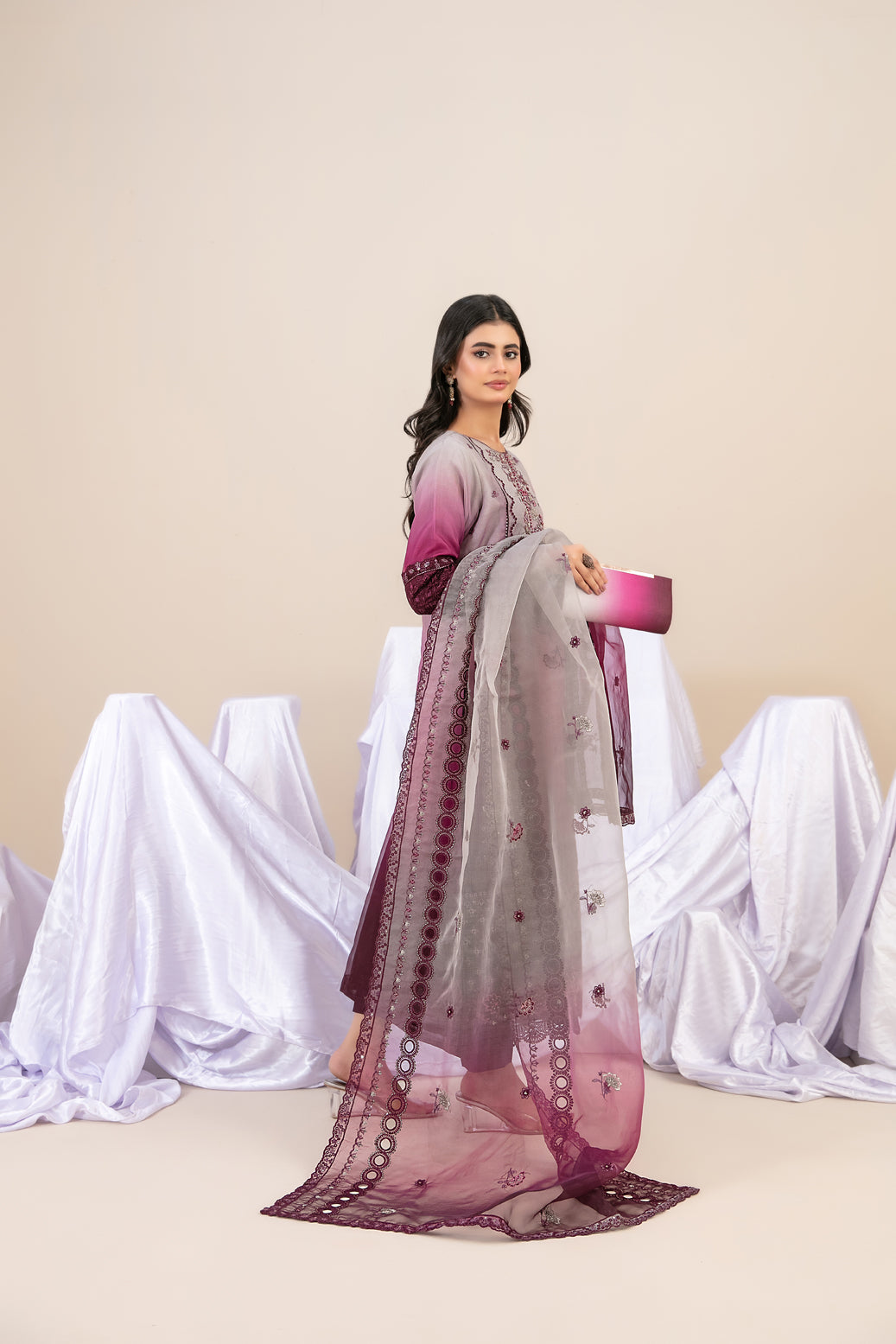 - Semi-Stitched Fancy Heavy Embroidered Organza Shirt with embellishments & Digital Ombre Printed Raw Silk Inner