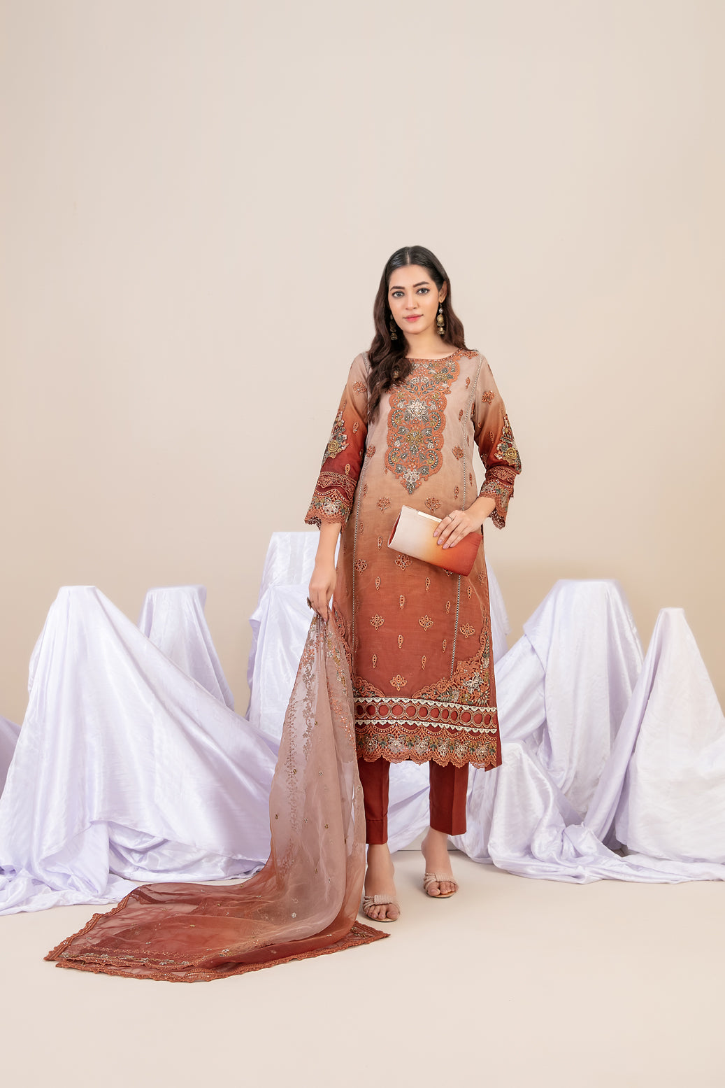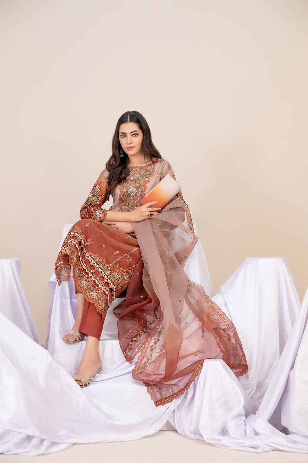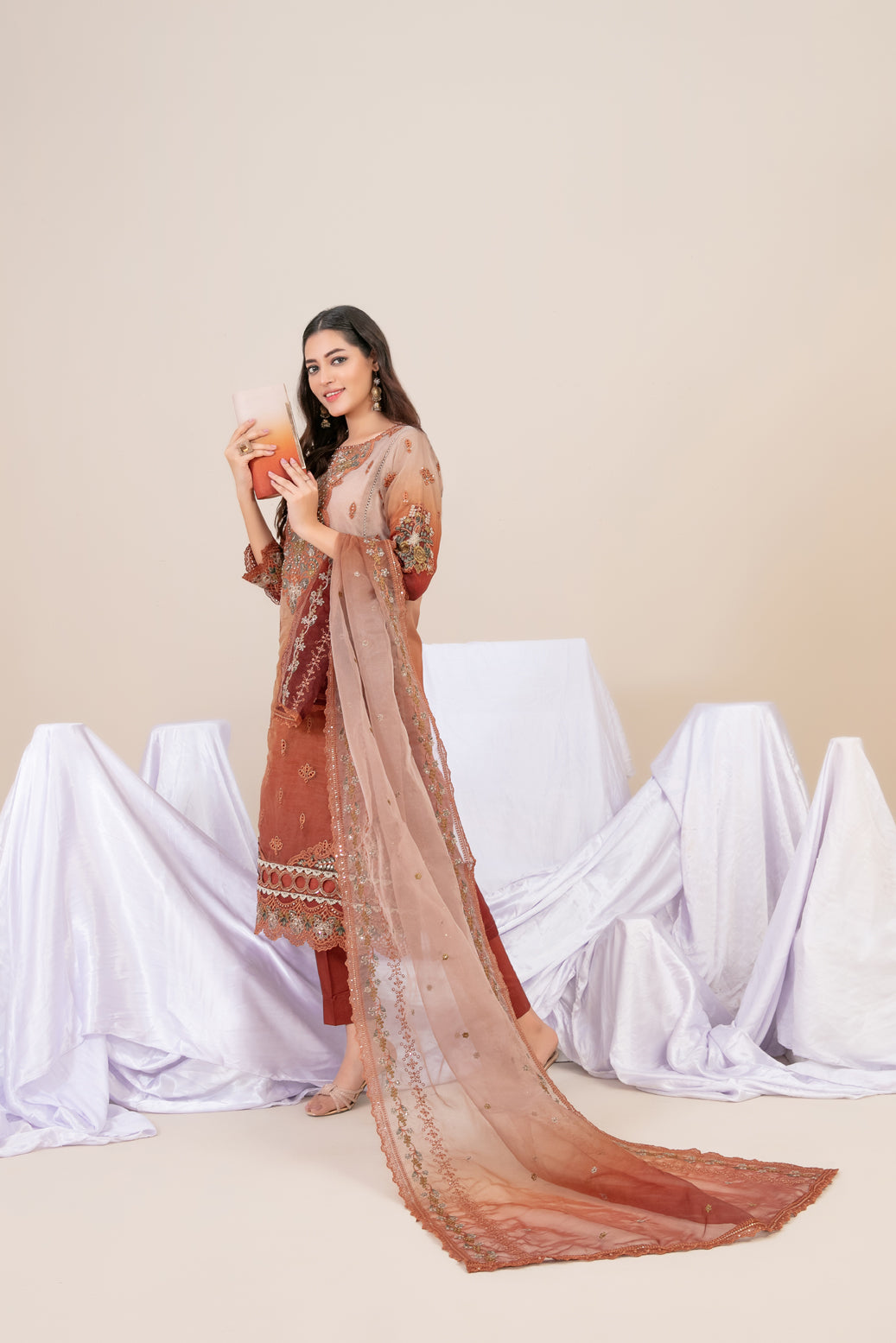 - Semi-Stitched Fancy Heavy Embroidered Organza Shirt with embellishments & Digital Ombre Printed Raw Silk Inner