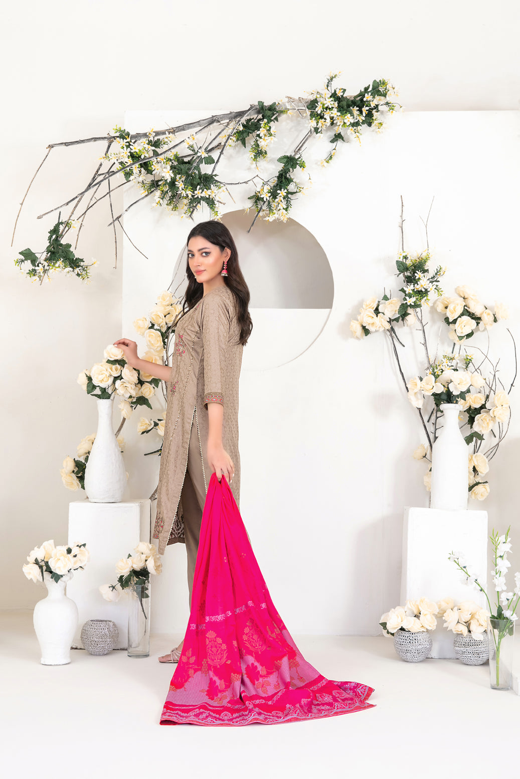 3 Piece Stitched Collection By Tawakkal Fabrics, Attractive & Elegant Viscose Jaquard Collection comes with: