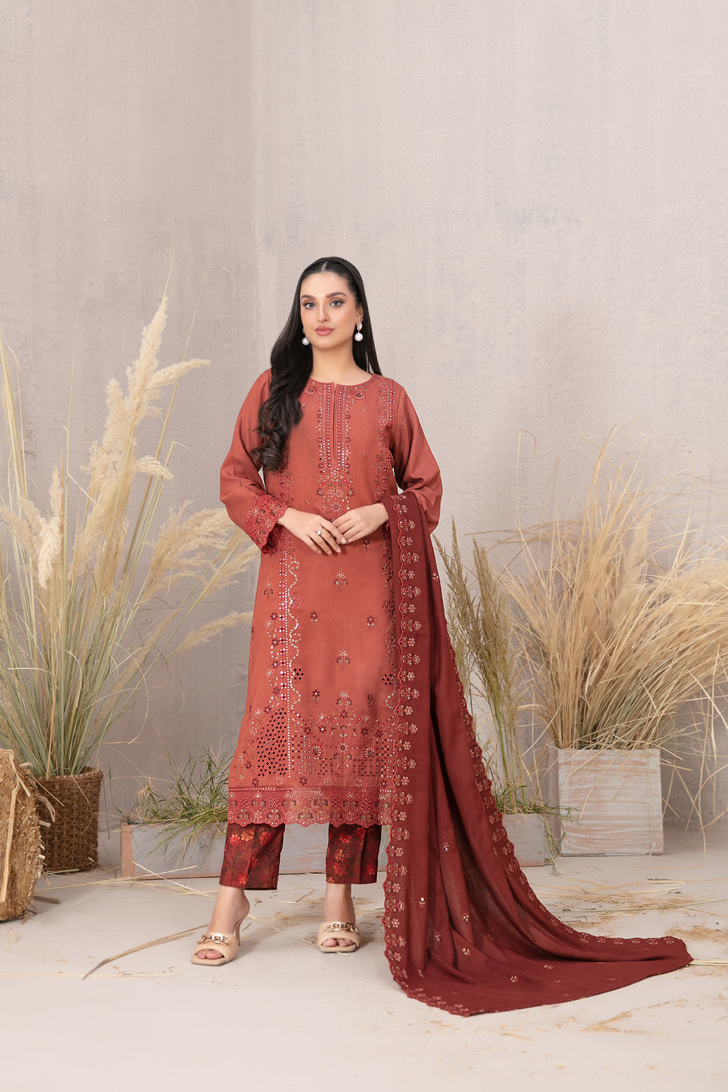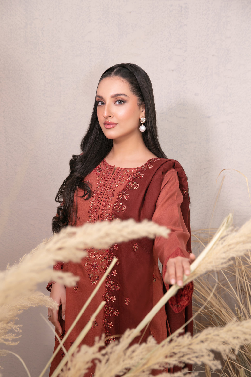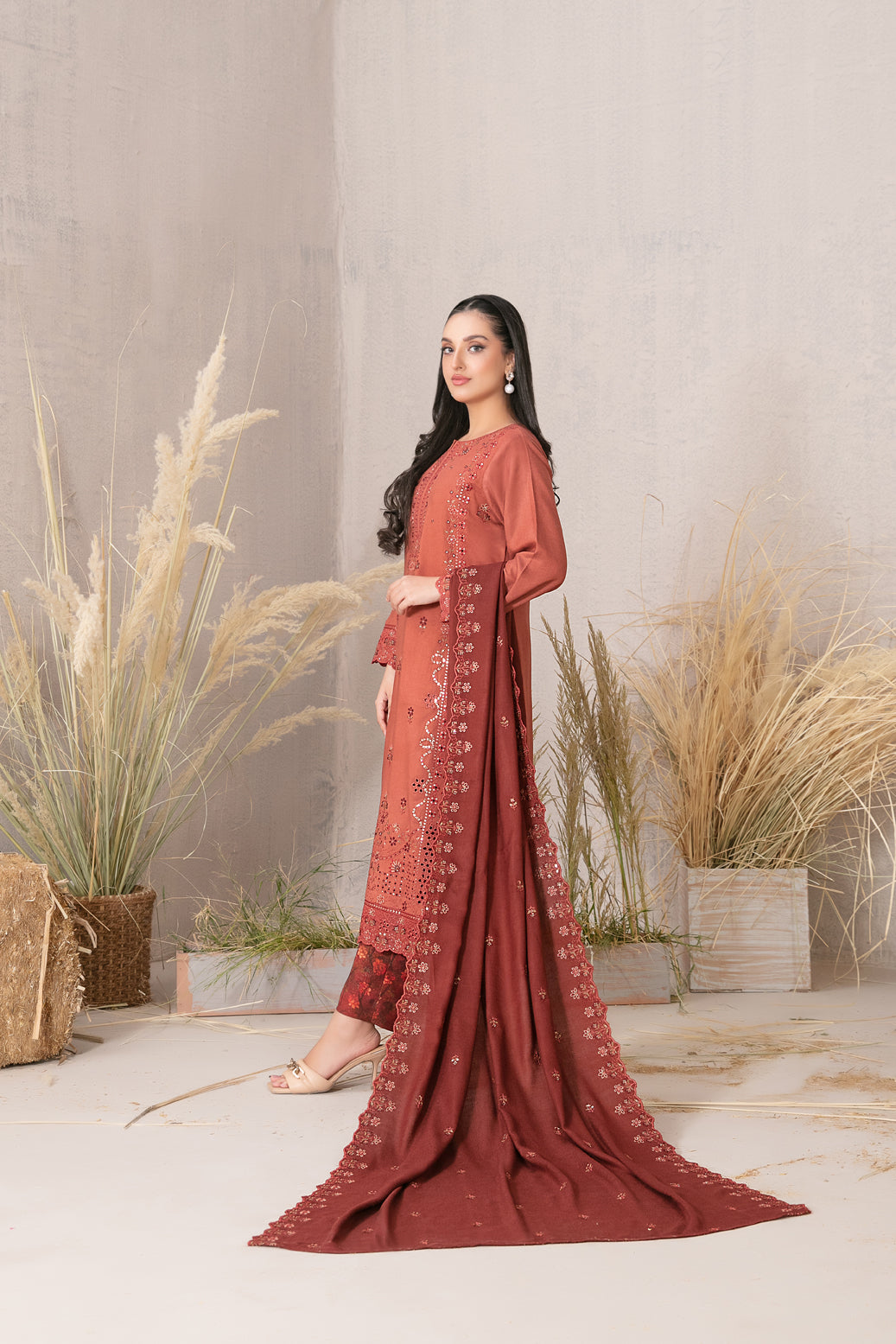 - Embroidered Leather Peach Pashmina Shawl Dupatta