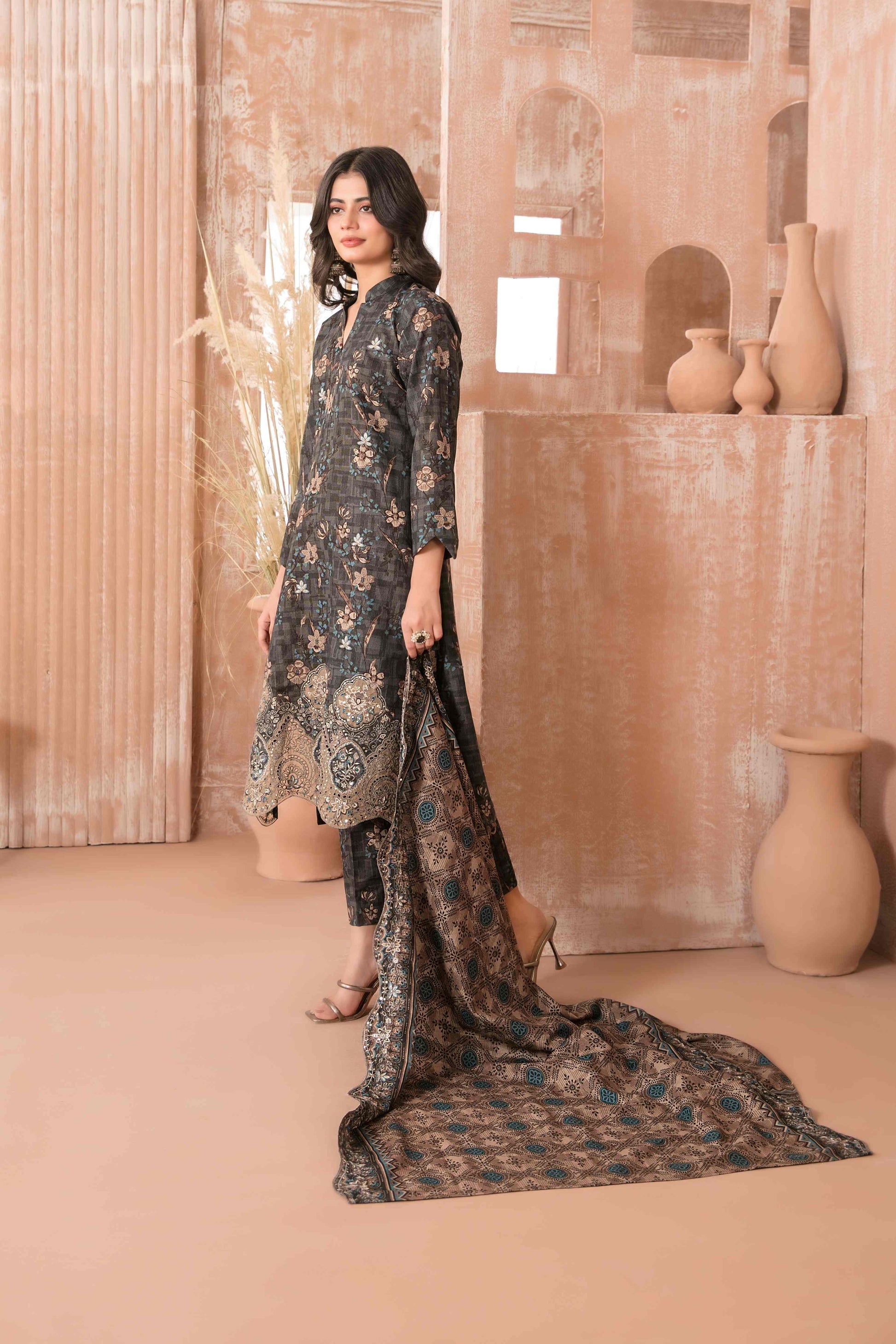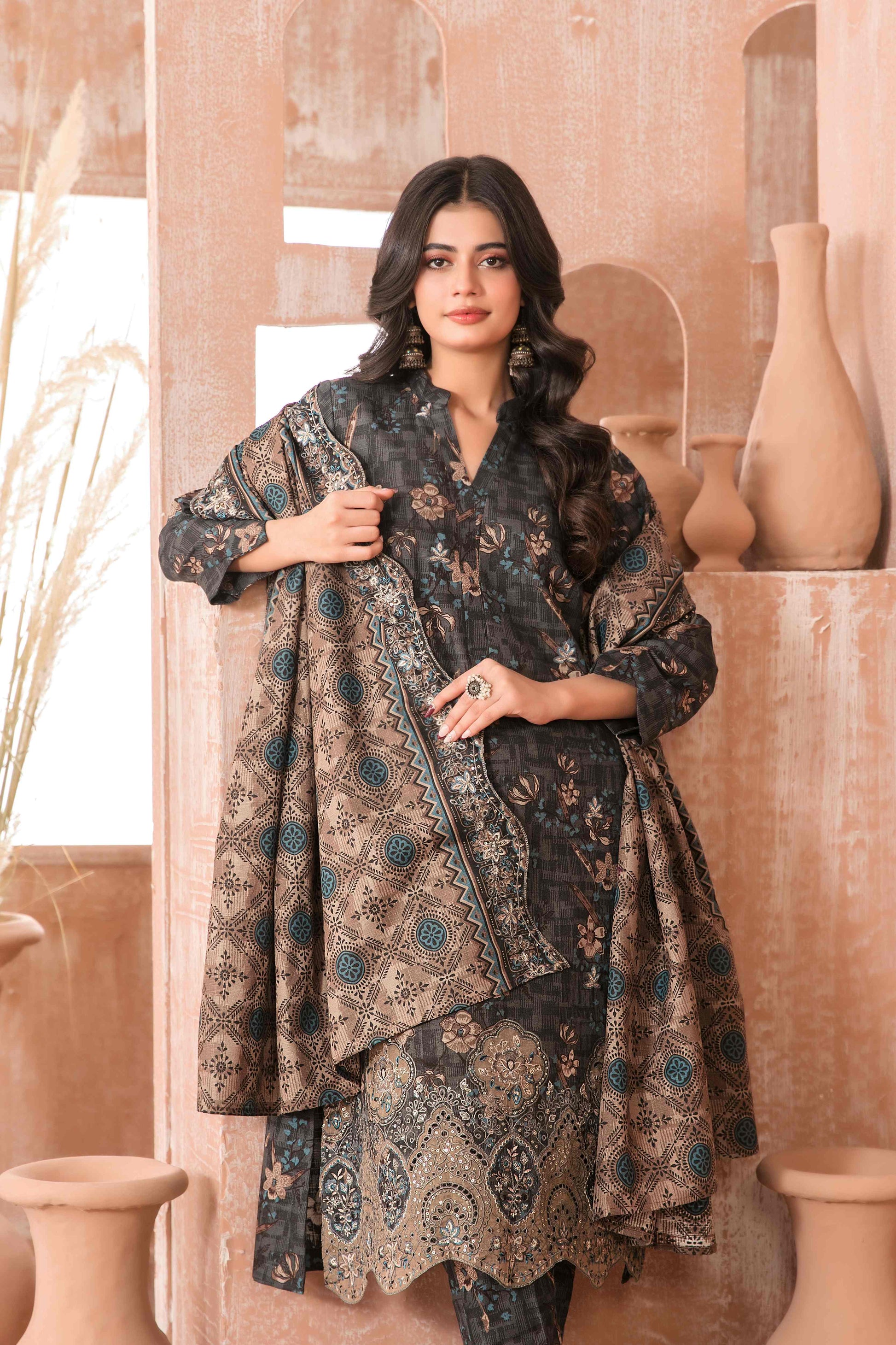 • Exclusive Rotary Printed Cross Khaddar Embroidered Cutwork Dupatta