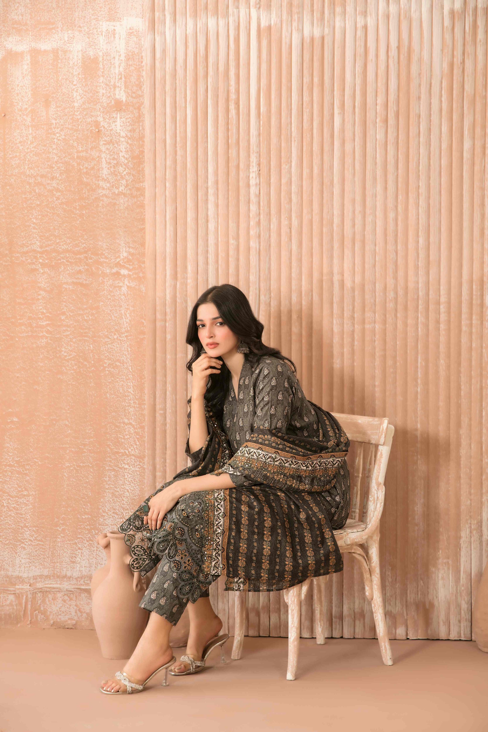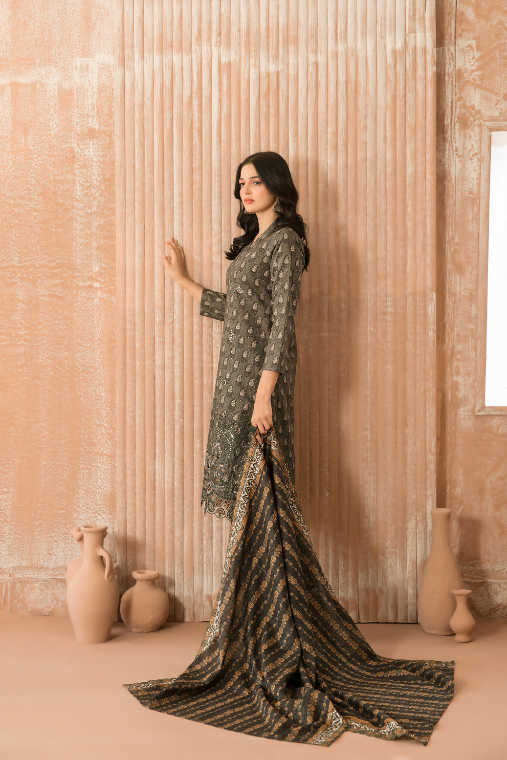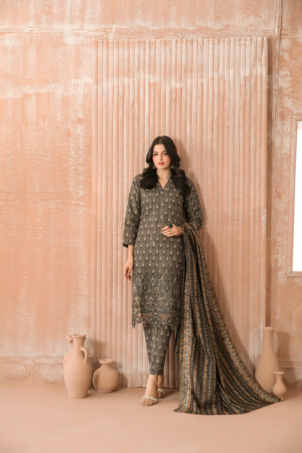 • Exclusive Rotary Printed Cross Khaddar Embroidered Cutwork Dupatta