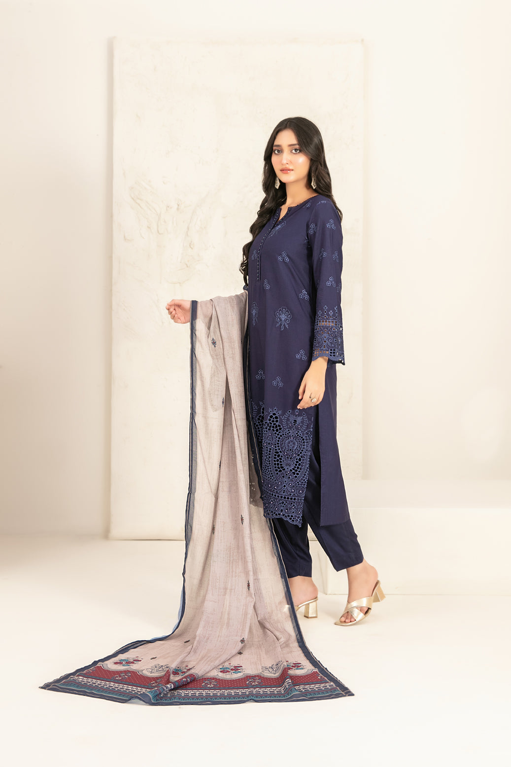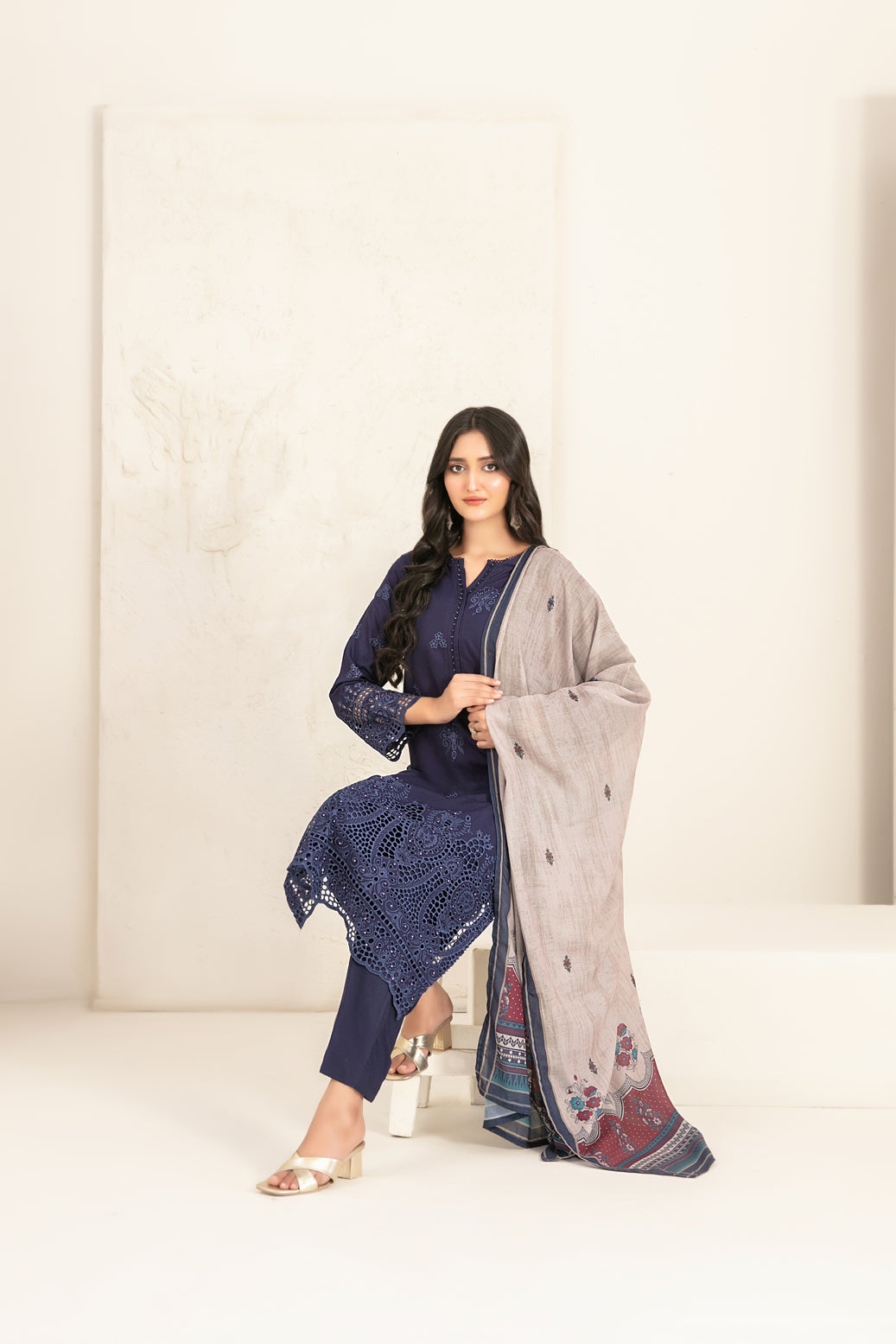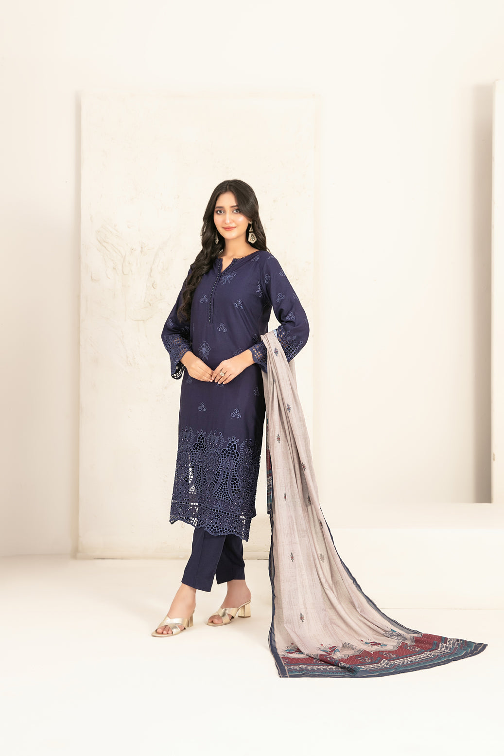 • Stitched Schiffli Embroidered Staple Shirt Designs with Embellishments