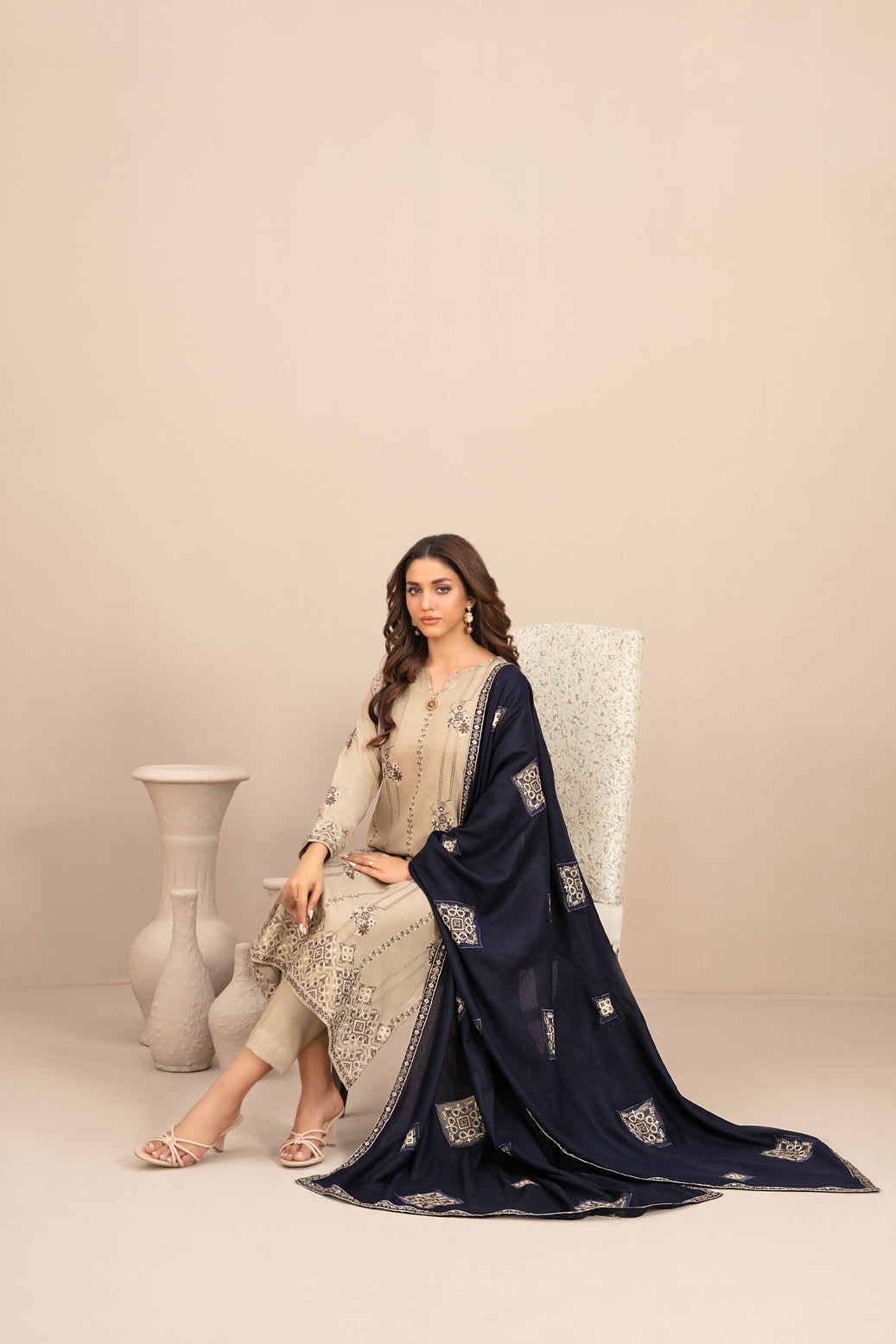 3 Piece Semi-Stitched Collection By Tawakkal Fabrics, Attractive & Elegant Embroidered Pashmina Leather Peach Shawl Collection: