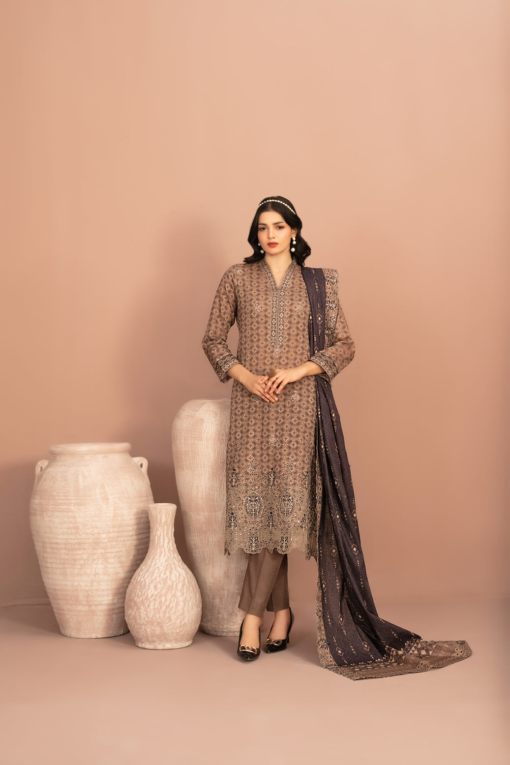 3 Piece Un-Stitched Collection By Tawakkal Fabrics, Attractive & Elegant Embroidered Leather Peach Collection 2025: