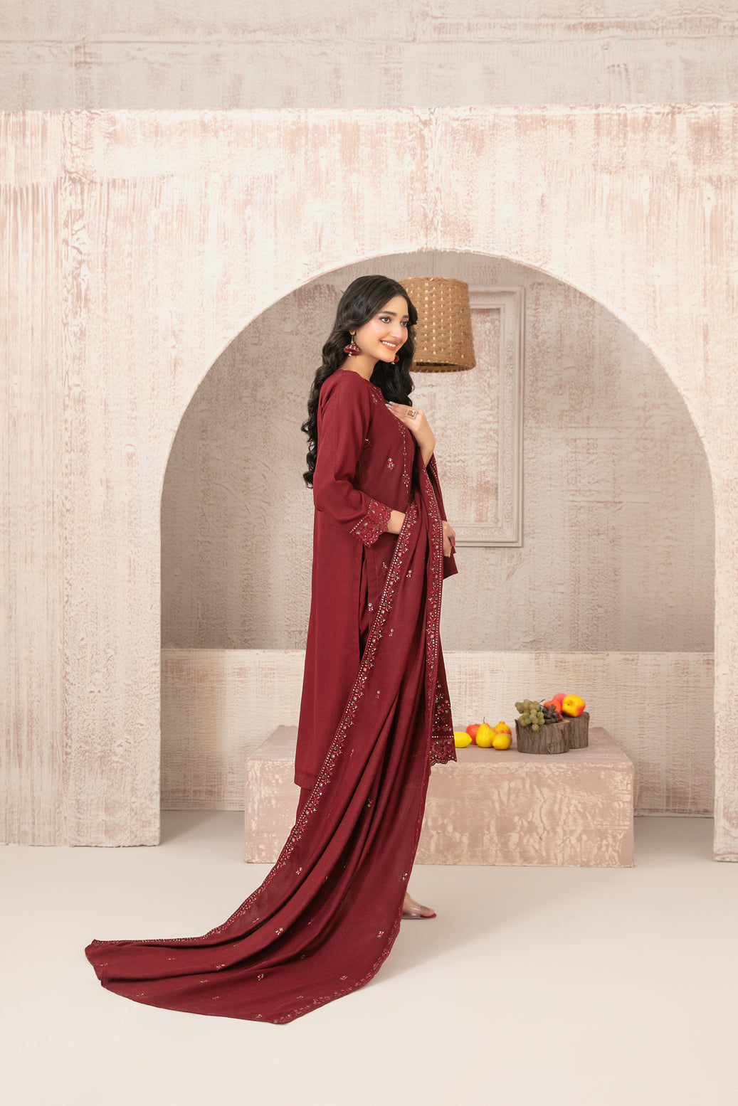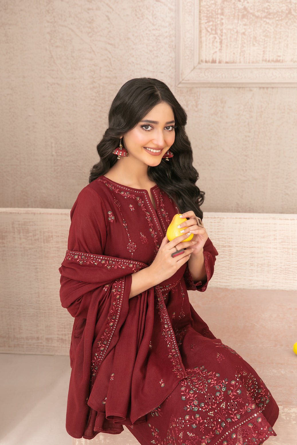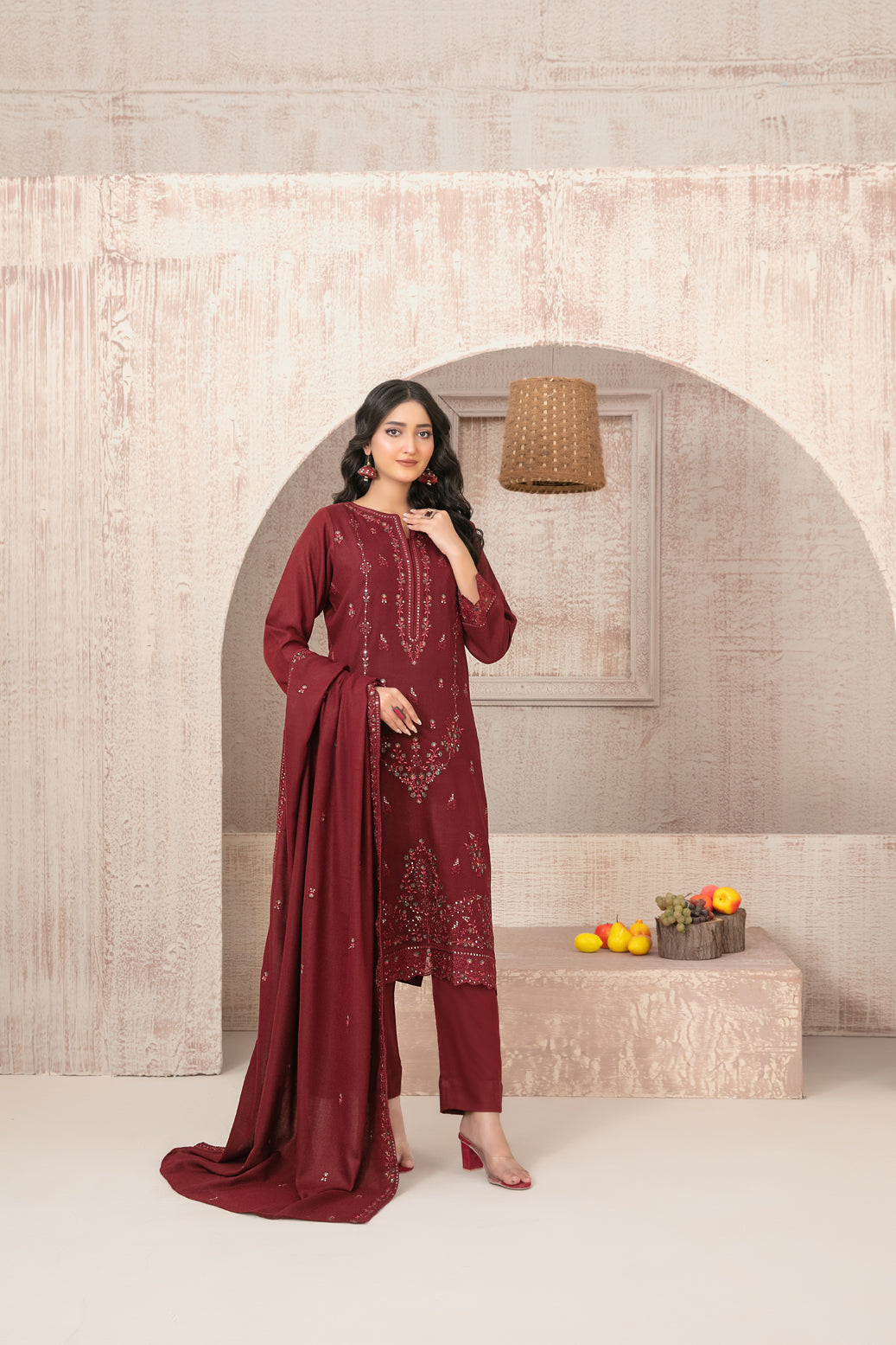 - Embroidered Pashmina Leather Peach Shawl Dupatta